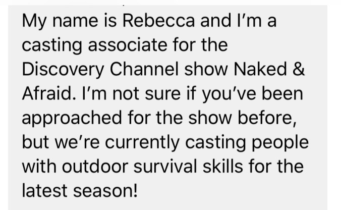 Look, Rebecca. I’m probably not what you’re looking for. The idea of being stranded in the wilderness doesn’t scare me. There is no “afraid” in that idea for me.