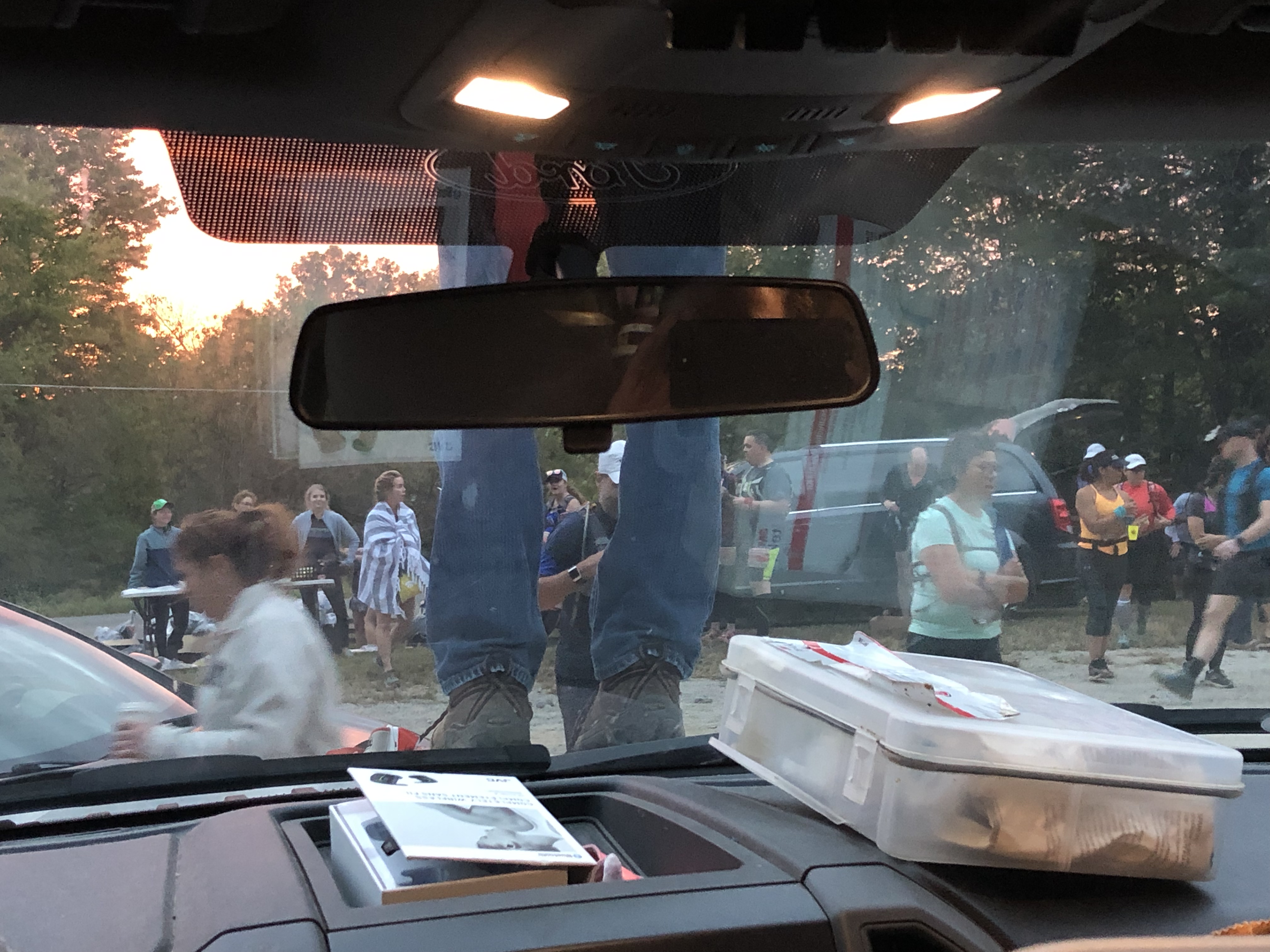 So rather than allowing me to lay across the hood of a volunteer’s running minivan Whitesnake style, the race director shoved the six of us into his truck. As he stood on the hood for the pre-race announcements.