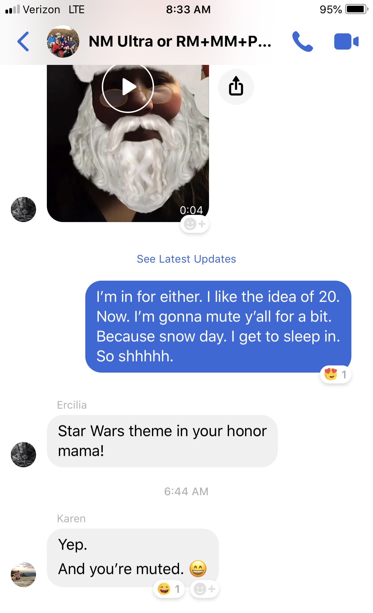 The Tiny Brazilian starts messaging the world about our Saturday options. And I just don’t even have it in me to fight it.