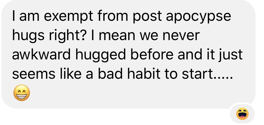 I just need to awkward hug some people. Like, a certain amount of people. Or maybe just certain amount of time. To get back up to pre-apocalypse hug levels.