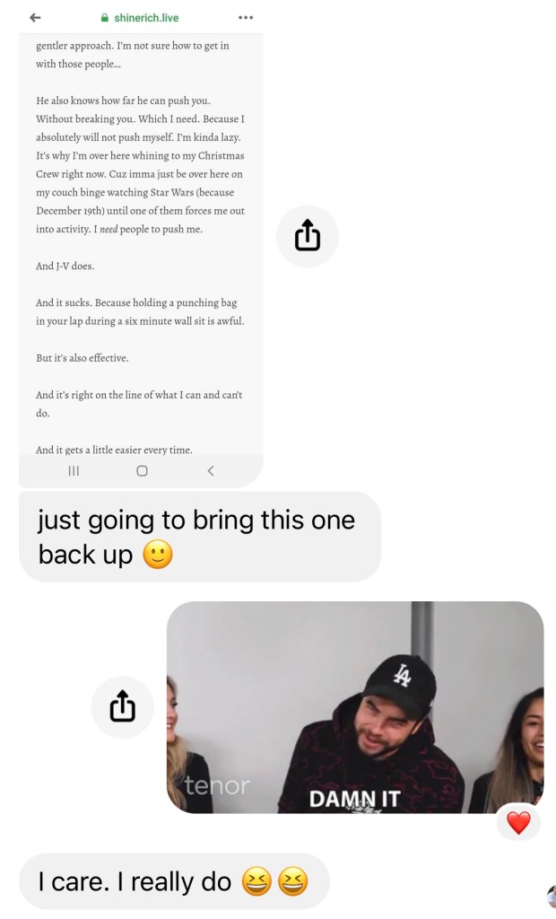 Got a decent reprieve when B-Major came to pick up their Mini Major. And lured J-V outside. And on her way out the door said, “relax a little, Sunshine.”
