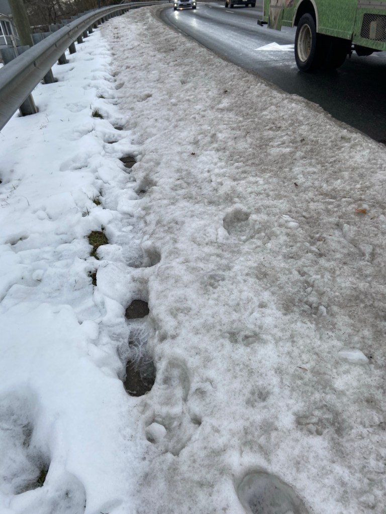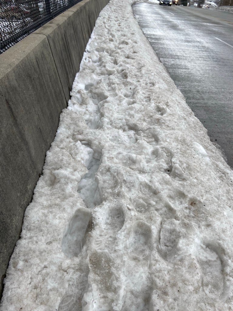 I had to cling to the cement wall. To keep from sliding off into traffic.