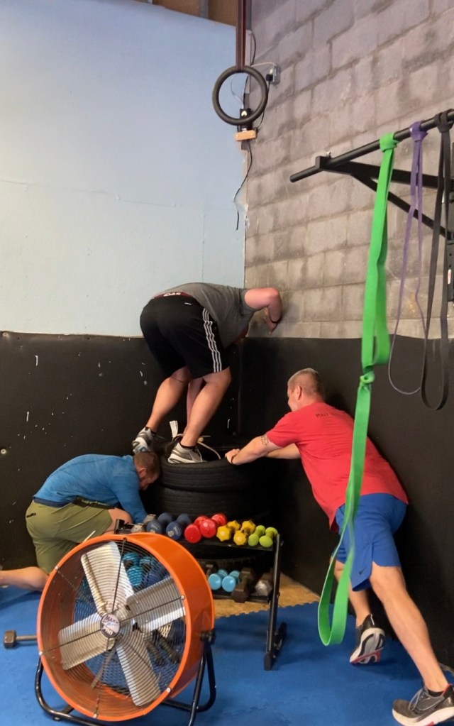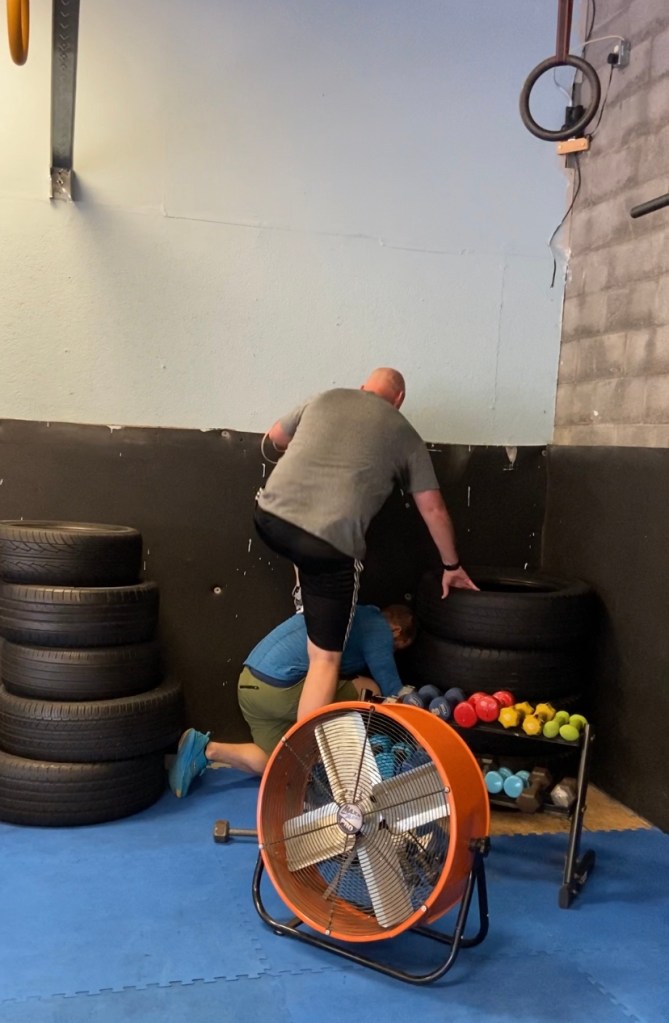 There were moments. Where voices of reason (read female voices) offered up solutions. Such as stacking the boxes we use for box jumps. But obviously these stacked tires will offer sufficient stability. You just need someone to hold them.